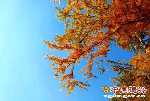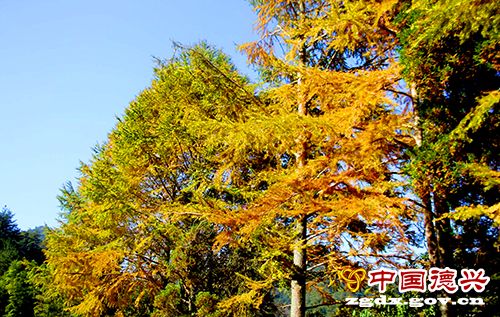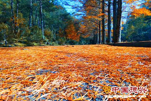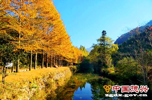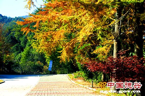 初冬的梧风洞 初冬时节,走进梧风洞景区,最吸引人眼球的,莫过于道路旁的两排杉树,树冠塔形,合抱之围,壁立高耸,直刺蓝天。秋霜染红的枝条,装点了澄碧蓝天,随风凋落的残叶,绚烂出一地金黄。(叶丽颖 记者胡坤明 摄)