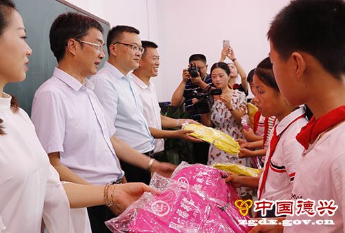 随后,王建华等与相关单位负责人一起将书包送至孩子们的手中。