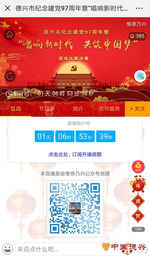 6月29日晚7点,德兴市纪念建党97周年暨“唱响新时代 共筑中国梦”歌咏大赛决赛正式开赛!德兴报社“惟德乃兴”微信公众号平台将为您现场直播决赛实况,此次直播采用多机位多角度进行拍摄,现场切换传输信号,正规专业团队将带给您更加直观、全方位的视觉体验!